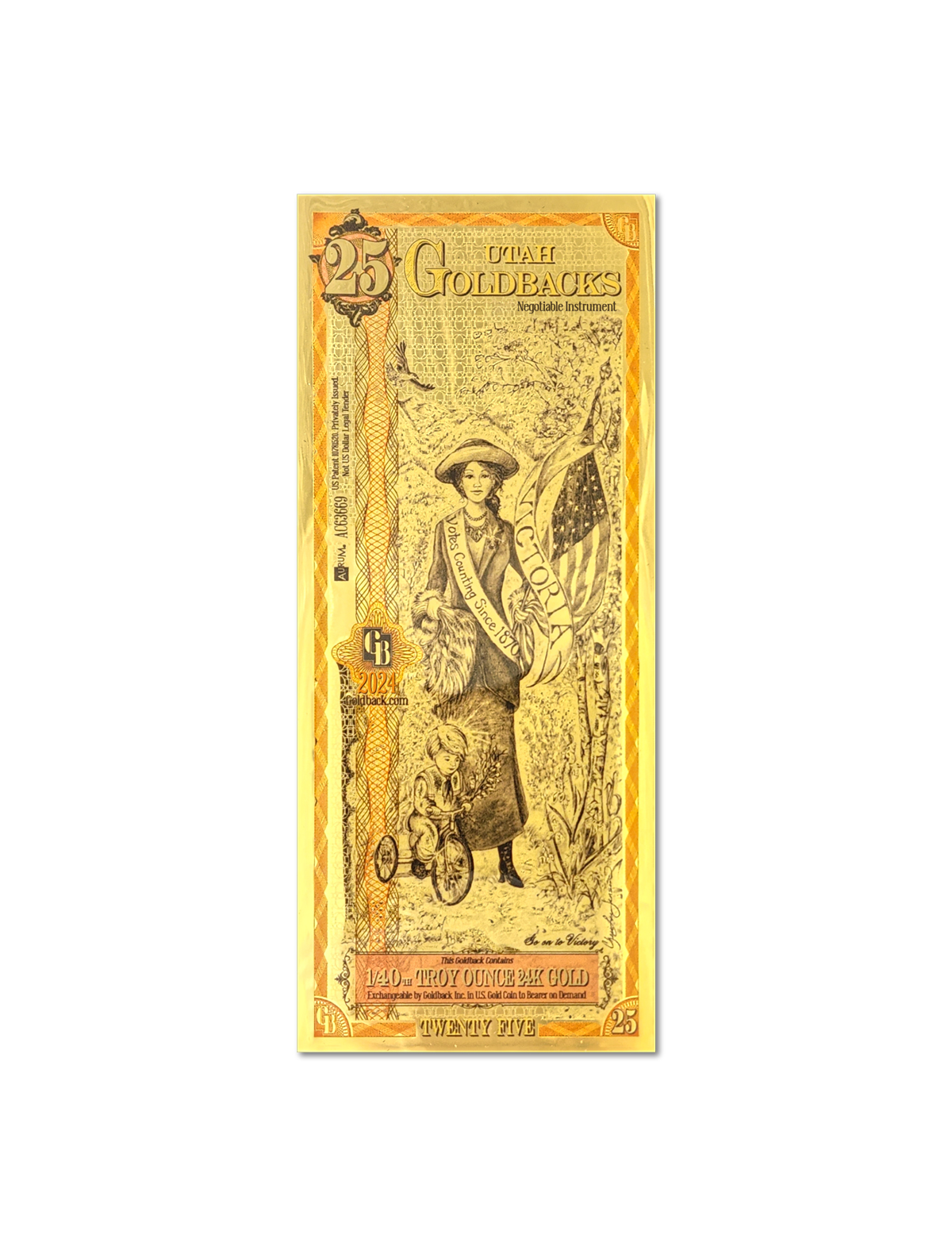 The 25 Goldback Design depicts the Lady Virtue Victoria, or Victory, primarily in celebration of Women’s rights to vote. This is actually the first Goldback design to ever have been done. It was the artist’s audition piece for the series. Victory bears a banner that states “Votes Counting Since 1870”, nodding to the fact that when Utah became a state, women were already voting by that time. The first state to have a woman actually cast a vote in it was Utah (Seraph Young was the voter), though as a state, Wyoming granted women’s suffrage a few months prior to that. This Goldback design was created by keeping many of the firsts in mind that women in Utah have done, such as women teaching over the pulpit and Martha Hughes Cannon becoming the first woman State Senator in 1911.