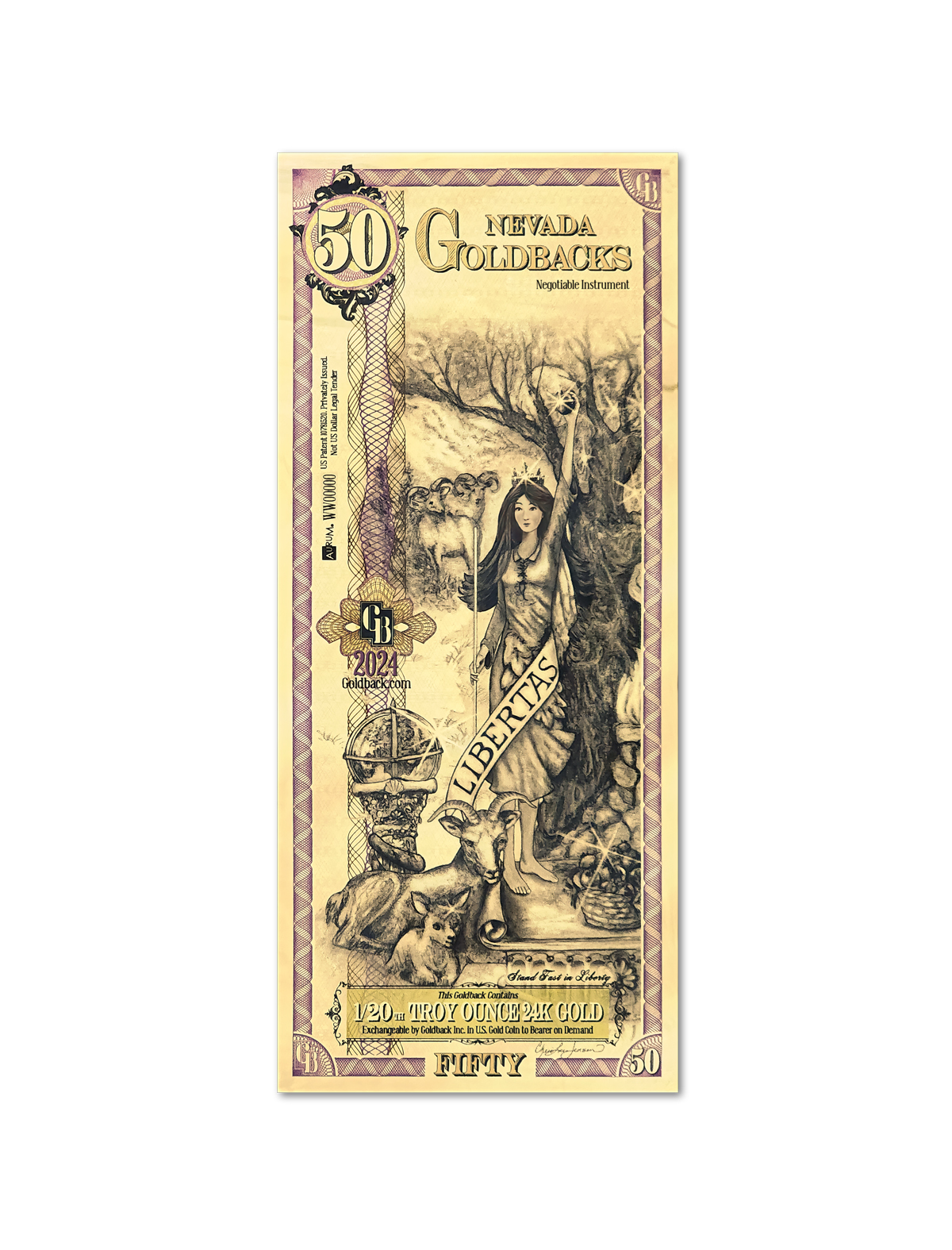 The 50 Nevada Goldback was introduced in 2020 with the launch of the second state to receive a Goldback series. This note features 1/20 Troy Ounce of 24k Gold.