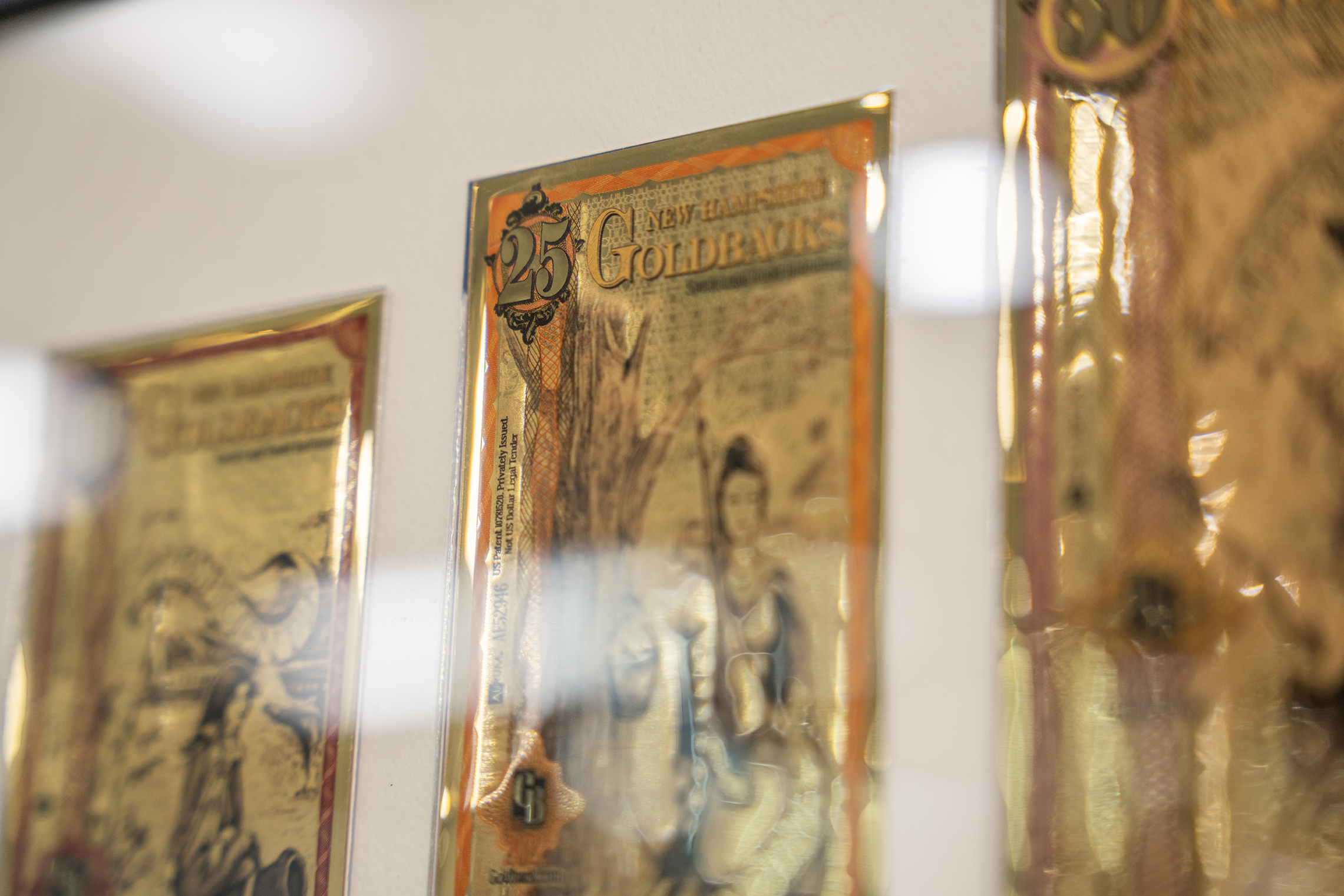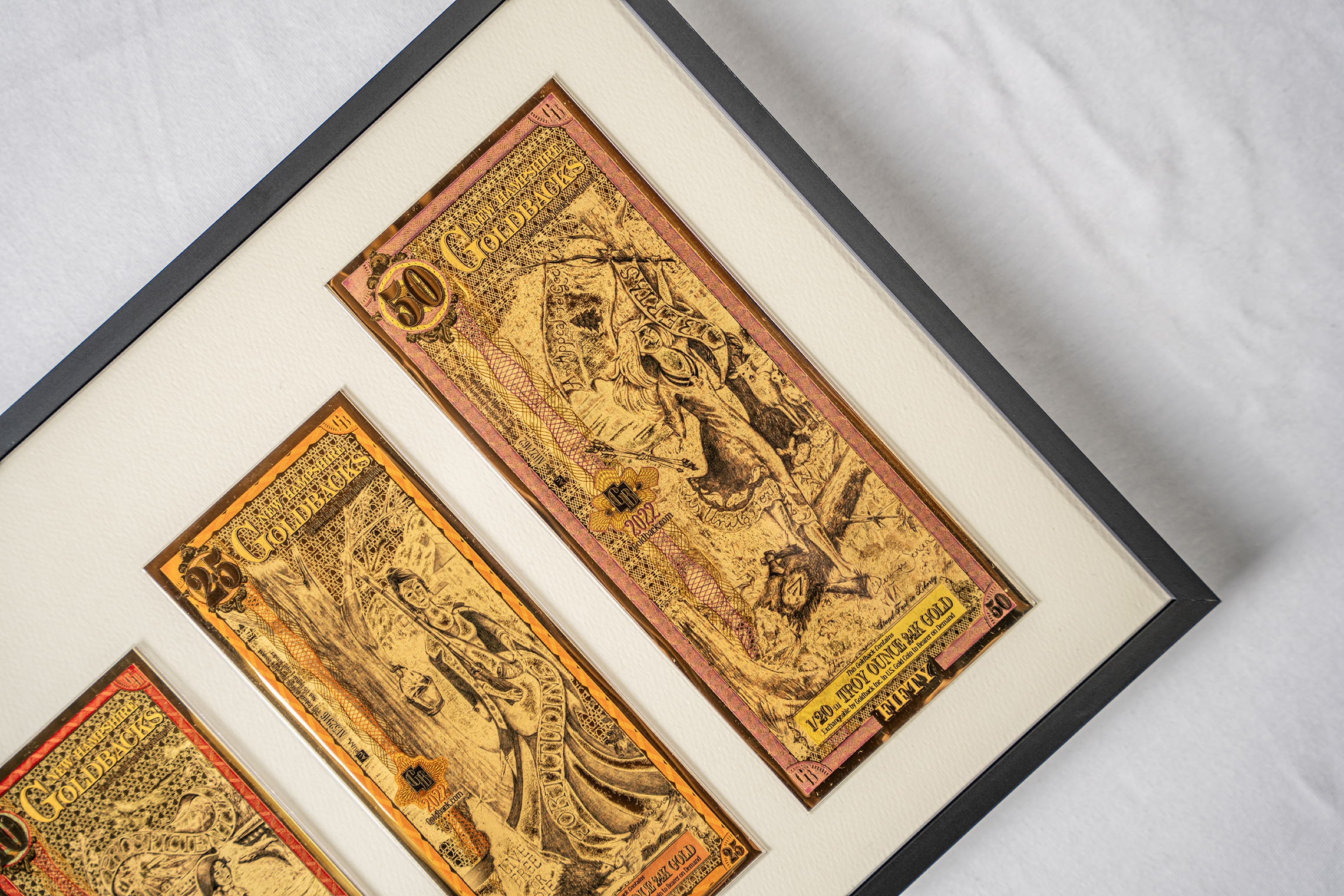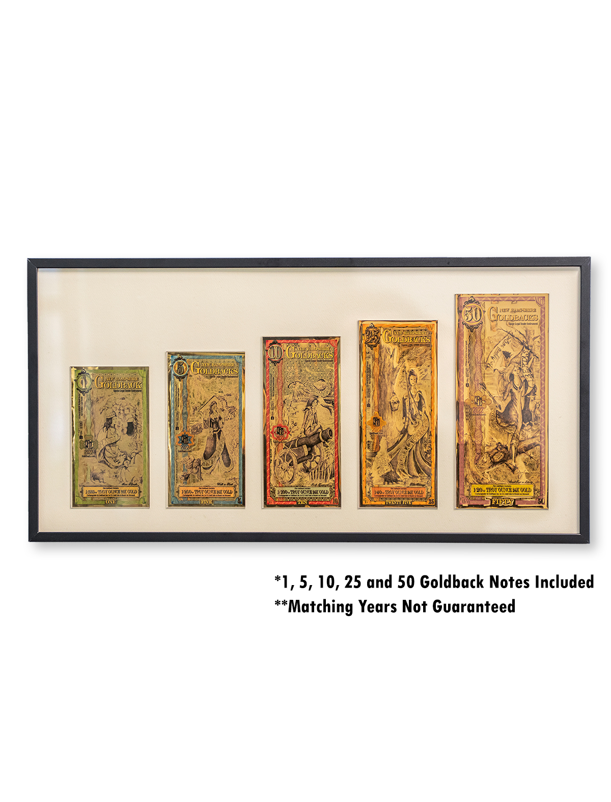 This beautiful New Hampshire Goldback Legacy Wall Display includes all five denominations of the New Hampshire state series. This frame features a custom mat that fits all five denominations, and an elegant and durable aluminum frame measuring 9 x 18 inches. Notes can be easily swapped out to your liking to personalize the set that is on display. This Legacy Wall Display makes an amazing gift—perfect for display in your home or office.